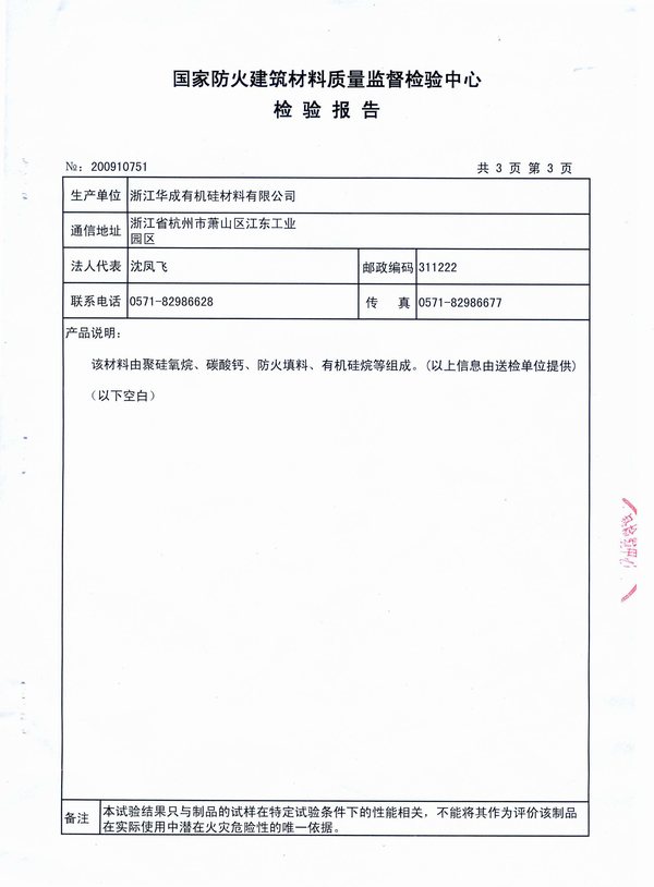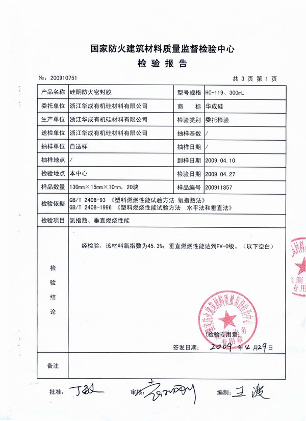 浙江華成喜訊: HC-119防火膠通過國家檢測