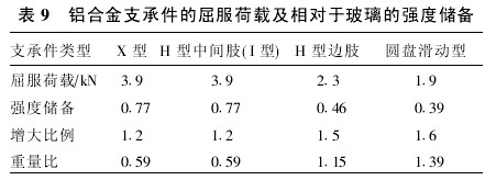 采用鋁合金材料時,支承件各肢所能承受的垂直于其平面的荷載及相對于玻璃的強度儲備見表9。表9表明,當采用鋁合金材料時,支承件各肢與玻璃板的強度儲備都小于1。為使強度儲備值達到1,可以等比例增大鋁合金材料支承件的尺寸。根據式(3)、式(4)和表9,