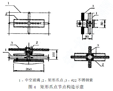 水平與豎向拉索采用矩形爪的構(gòu)造措施(如圖4),矩形爪點構(gòu)造尺寸為260mm×80mm。為加強爪點抵抗水平負風壓的能力,爪點采用了槽形構(gòu)造。爪點外夾片與內(nèi)夾片用不銹鋼螺栓相連。在內(nèi)、外夾片的背后,由兩塊帶凹槽的壓塊通過四根不銹鋼螺栓將水平與豎向拉索錨固鎖緊。