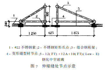 主體建筑伸縮縫每一45m一道,在其兩側(cè)各設置一榀三角形空間桁架,幕墻玻璃在伸縮縫處斷開,用單獨設計并開模的鋁合金型材封邊收口(如圖7)。受溫度影響時,每45m跨伸縮縫索網(wǎng)單元間相互不受約束和限制,保證了結(jié)構(gòu)的安全。