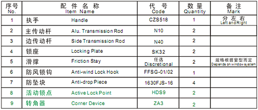 幕墻上懸窗(MQ300)五金配件選配表
