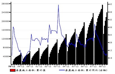 從房地產行業數據看:2009年前6月全國商品房施工面積同比增長12.7%,比上月微漲1個百分點,增速下滑的態勢止住,并呈現一定的觸底回升跡象;2009年前6月全國房屋新開工面積同比下滑10.4%,新開工面積同比減少的速度也放緩,出現一定的企穩跡象,具體見圖4、圖5。這將對玻璃的需求構成一定的支撐。