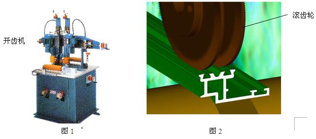 開齒是通過安裝在開齒機(圖1)上的硬質滾齒輪在鋁型材用于穿條的槽口頸部滾出齒來,是特別關鍵的一道工序。滾齒輪通過傳輸機構由電機驅動而產生轉動,滾齒輪外緣的60度形狀的齒壓在鋁材槽口中央并施加一定壓力,帶動鋁材向前移動,同時在壓過的槽口外沿滾出齒來(圖2)。滾齒輪通過導軌能上下左右調節,以適應不同高度和寬度的型材。