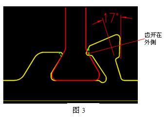 齒應開在槽口的外錘頭側,在內錘頭盡可能不開齒或只開很淺的一點齒(圖3)。原因是在后面的滾壓工序中,外錘頭會產生以自己頸根部為圓心的旋轉變形而將開好的齒壓入隔熱條,從而保證滾壓后隔熱鋁材的剪切強度。而槽口的內側為定位部位,用來保證滾壓后隔熱型材的整體形狀尺寸,就算內側的齒開的很好,滾壓后也壓不到隔熱條里,因此沒有任何效果。