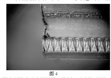 好齒形的齒峰應小于0.2mm,不超過齒距的三分之一左右(見圖4),這樣滾壓時才容易壓入隔熱條內。如果開齒太鈍或沒有開齒,就難以壓入隔熱條,隔熱型材的剪切性能就無法保證。開齒的好壞主要由開齒輪質量、機器設備穩定性和操作水平來決定的。開齒輪外緣的齒形斜面應左右不對稱,外側角度應大些,這樣方便將齒開在鋁材槽口外側。開齒輪是損耗件,時間一長外緣的齒就會逐漸磨損(詞條“磨損”由行業大百科提供),一般建議120噸左右要換新的開齒輪,當然這要看開齒盤的材質,差一些的幾十噸就要更換,好一些的進口輪能使用更長的時間。好的設備因穩定性好,往往更容易保證開齒的質量,若設備的穩定性欠佳,就會造成開齒盤的跳動,使得同一支型材一段開齒好,一段開齒不好,影響整體的開齒質量。