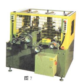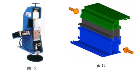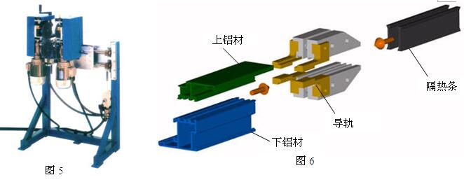 穿條是將隔熱條通過穿條機(圖5)導軌穿入已經開好齒的上下兩支鋁材的槽口中(圖6),使三者連接一起。有些設備的穿條工序整合在開齒機中,即在開齒的過程中就將隔熱條穿入鋁材中。穿條后隔熱條和鋁材之間沒有緊密結合,是松動的,條與鋁材之間能相互竄動。隔熱條是由電機帶動的一組齒形輪驅動向前穿入上下鋁材的槽口中,完成穿條的。對于一些兩槽口中心距離小于10mm的鋁材,一般難以用穿條機直接穿條,這時只能用人工手動穿條了。