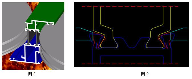 滾壓是將已穿好條的型材通過滾壓機(圖7)的三組滾壓盤將鋁材與隔熱條緊密的結合在一起(圖8)。滾壓時,在兩滾壓盤的共同作用下,鋁材的外錘頭各自以自己頸根部為旋轉中心壓向隔熱條(圖9),錘頭上的開齒壓入隔熱條,使得鋁材與隔熱條緊密的結合在一起。