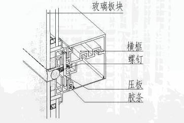 典型的結構是帶有周邊附框的玻璃板塊通過一定間距的點壓板壓在框架上,通常橫梁設有凸臺,托住玻璃板塊。(圖1)