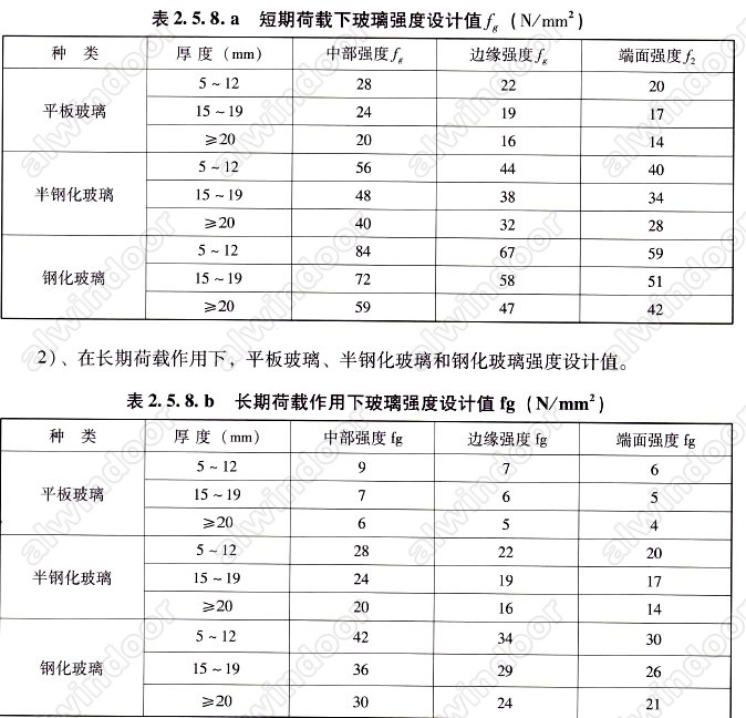 1)、在短期荷載下,平板玻璃、半鋼化玻璃和鋼化玻璃強度設計值。