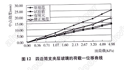 為了對比分析,現給出四邊簡支夾層玻璃在荷載作用下的原規范值、試驗值、有限元模擬理論值和修正后的規范計算值,如圖12所示。
