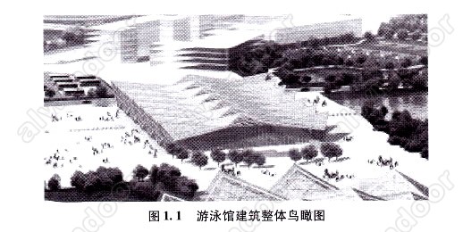密封。整個結構構成鉆石狀的水晶造型。尤其在夜間,透明的外飾面如同巨型的發光體,烘托出濃烈的節日氣氛。該建筑獨具匠心的造型彰顯了深圳這座新興國際大都市的鮮明個性和獨特魅力,同時也標志著該地區又一個地標性建筑的誕生。游泳館建筑整體鳥瞰圖見圖1.1所示: