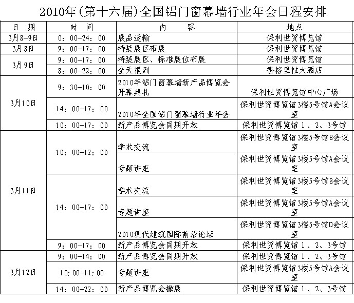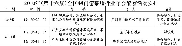 2010年(第十六屆)全國(guó)鋁門窗幕墻行業(yè)年會(huì)日程安排表