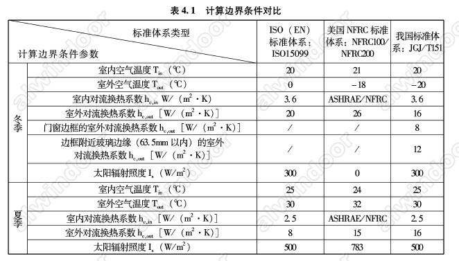 設計標準來確定工程實際計算邊界條件。所以確定標準的計算邊界條件是門窗幕墻產品熱工性能設計的前提,各標準體系的標準計算邊界條件存在著較大的差別,如表4.1所示。