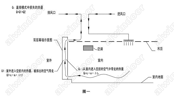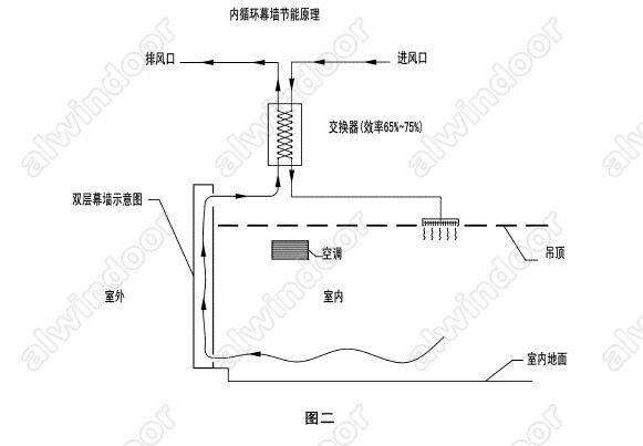 內循環雙層幕墻分類方法很多,這里不贅述。從是否具有節能功能的專業角度來說,內循環雙層幕墻應分為直排式內循環幕墻和交換式內循環幕墻兩大類。圖一是直排式內循環幕墻工作原理示意圖。圖二是交換式內循環幕墻工作原理示意圖。直排式內循環雙層幕墻工作原理是室內氣體經圖示線路從雙層幕墻進氣口(下口)進人雙層內腔,從幕墻上面出口進人排風管道排出建筑外部。排風動力裝置通常采用專用的軸流風機或其它滿足設計要求的排風機。內循環雙層幕墻靠自然通風往往效果不佳。室內需要的新風通過建筑立面上專