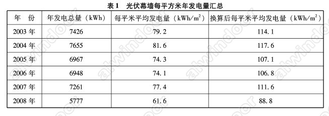 從2003年I月正式運作開始,一直對該光伏幕墻系統進行數據記錄并定期歸檔,保證了記錄數據的真實性和連續性c已運行近7年時間,截止到2008年12月,共6年整時間,累計發電量為鉭42034kWh,累計可發電天數為13%天。