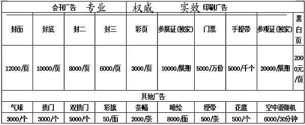 廣告費用: ★參展須知: ◆填寫參展申請書,加蓋公章后郵寄或傳真至大會組委會,參展申請被接收后組委會將通過傳真或郵寄方式發放“參展確認書”確認您的申請;展位按“先報名,先分配,先付款”的原則安排。 ◆申請被確認后3天內將所需費用匯入大會指定帳號,逾期不確認參展資格,展位按“先申請,先付款,先分配”的原則安排。 ◆會前一個月組委會將發一份參展手冊(包括:報到地點、貨物運輸、酒店住宿等),協助參展企業完成參展后續服務。參展一經確認,參展商不得撤消參展和轉讓展位。因某種特殊原因或不可抗拒因素時,組委會有權將展期和展場更改,若因某種原因取消本次會議,參展商所交費用全部退回; 4、組委會根據現場實際情況有權對極少數參展企業的展位予以現場調整。
