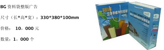 博覽會(huì)數(shù)以萬計(jì)的展商和觀眾將提著印有貴公司標(biāo)識(shí)和廣告的手提袋,用以攜帶大會(huì)會(huì)刊,參觀指南,及其它展位上搜集的資料。資料袋將在各登記處發(fā)給到會(huì)的展商、會(huì)議代表和觀眾。