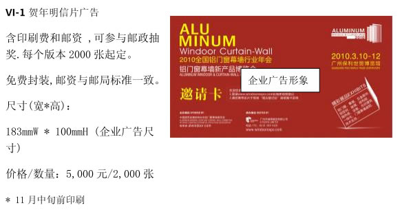 主辦單位將會(huì)為2011全國鋁門窗幕墻新產(chǎn)品博覽會(huì)大量派發(fā)宣傳的印刷品,如展前預(yù)覽、門票等等;還有會(huì)刊、胸卡背面廣告在這些印刷品上投放宣傳,將使貴司形象第一時(shí)間展示于獲邀的每一位高質(zhì)量的專業(yè)觀眾面前,令你獲得極大的收益和永久的收藏價(jià)值。