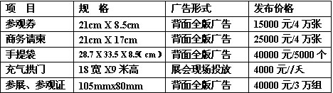 ◆參展費用: 標準展位費:(3m×3m) 空地基本價(面積不低于36m2) A區 14800元/展位/展期 A區 1400元/ m2展期 B區 12800元/展位/展期 B區 1200元/ m2展期 合資 19800元/展位/展期 合資 1800元/ m2展期 境外2800歐元/展位/展期 境外220歐元/ m2展期