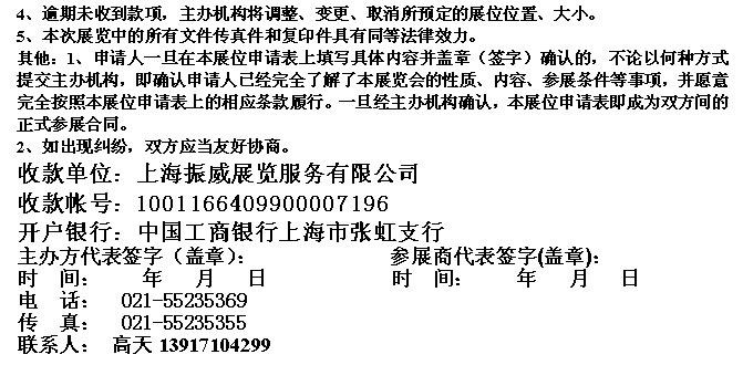 在申請展位一周內將參展費用[50%(定金)或全款]電匯或交至組委會。
