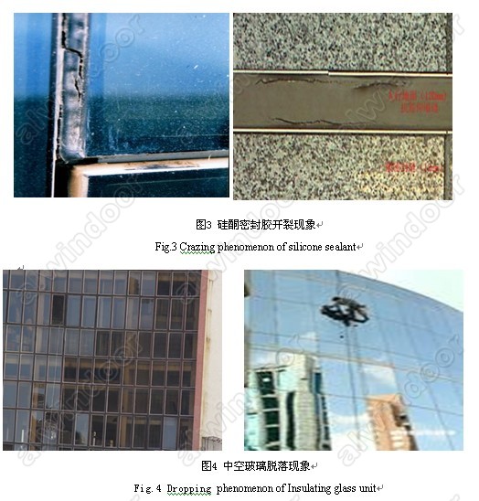 脫落。下圖為某工程所用的摻白油硅酮密封膠后出現(xiàn)的開以及中空玻璃脫落現(xiàn)象裂現(xiàn)象。