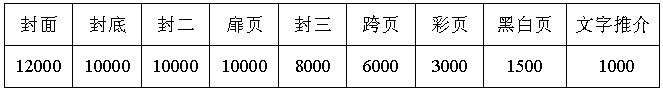 本屆大會(huì)《會(huì)刊》一書為大32開(140×210)進(jìn)口銅板紙彩色精印,圖文并茂,它將盡列展會(huì)詳情、展商及產(chǎn)品介紹,是本次大會(huì)對(duì)外宣傳、行業(yè)交流、資料查閱獨(dú)一無二的宣傳資料,并且具有長期的廣告效應(yīng)。其價(jià)格如下: