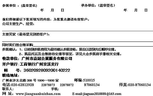 〈1〉參展單位請認真填寫《參展合同書》報名表加蓋公章、簽名后郵寄或傳真至大會組委會,并于5天內將各項費用匯至組委會指定賬號,并將銀行付款憑證傳真至組委會確認。