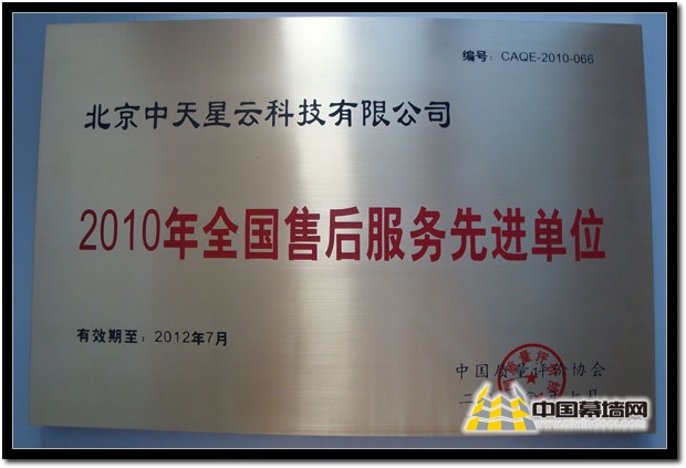 【中國幕墻網 08月09日消息 】2010年7月,經中國質量評價協會、北京企協企業評價中心的聯合評審,確認我公司的售后服務標準完全符合《售后服務評價指標》的各項要求,特授予北京中天星云科技有限公司“2010年全國售后服務先進單位”榮譽稱號,并正式接納為中國質量評價協會會員。當今社會,優質的售后服務是商品生命延續的重要形式,是企業聯系顧客、服務顧客、贏得顧客的重要方式之一,也是企業塑造形象和知名度的重要手段。因此,此項榮譽的獲得,不僅肯定了我公司現階段的售后服務質量,更加提升了公司在行業內的品牌定位,對于公司未來的發展有著深遠的影響和積極的推動作用。【完】