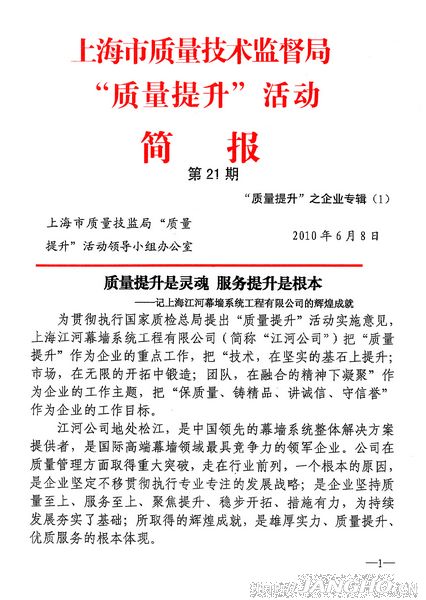來源:中國幕墻網收集整理 作者:* 日期:2010-8-9 頁面功能 [字體:大 中 小] [ 打印 ] [ 投稿 ] [ 評論 ] [ 啄木鳥 ]| 6月8日,在上海市質量技術監督局舉辦的“質量提升”活動中,江河幕墻以完善的質量管理體系、突出的質量提升榮獲上海市質量技術監督局表彰,并得到通報表揚。 |