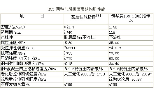 建設此類大橋就是要使用一種拼接用結構膠。它的性能要全面,特別是工藝性能要求很高,國內已有少數單位開發了此類膠種。表3列出其性能。
