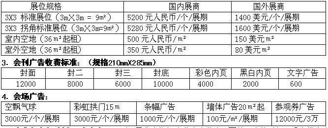 2.展位收費(fèi)標(biāo)準(zhǔn):(標(biāo)準(zhǔn)展位含洽談桌一張,椅子兩把,楣板一條,三面展板,射燈二只,220V/5A電源插座一個(gè)。空?qǐng)龅夭粠魏握辜芗霸O(shè)施,參展商可自行安排特殊裝修工作或委托組織單位推薦的搭建公司。國(guó)內(nèi)外企業(yè)區(qū)分以展品原產(chǎn)地為標(biāo)準(zhǔn))