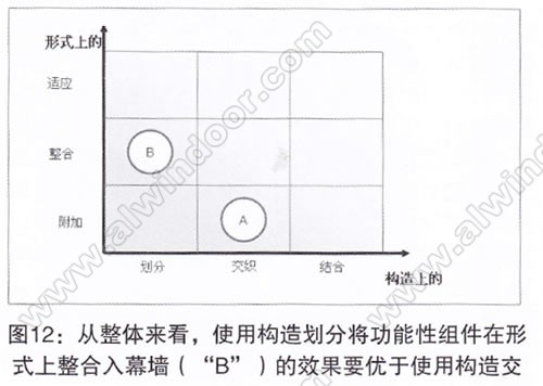 從窗戶和幕墻公司的角度看,整合完全是另外—回事。一座建筑的子系統和組件能夠以不同的方式連接在一起,這些方式主要包括劃分、交織和結合(圖12)。有大型承重外墻的地方,就會有承重結構與外立面的結合。在幕墻框架結構中,功能的劃分是非常清晰的。結構劃分的實質優點主要在于行業間的明確區分、恰到好處的保障和簡單的安裝及拆卸。當太陽能光伏裝置安裝到建筑外立面中時,中空玻璃與光伏電池組的結構性結合同樣能夠提供密封性能、隔熱、遮陽、防眩光、隔音性能并生產電能。真正的挑戰還在于能源與舒適感相脫節,幕墻的投資及應用成本與功能和設計質量相脫節(圖10)。此外,還要再次指出,與用戶滿意度相關的建筑特性不僅由與功能性和成本相關的基礎因素和績效因素構成,它也包括潛在的激勵因素。對于放眼未來的門窗幕墻公司而言,氣候變化不僅是激發合理的充足性和創新型效率戰略的動力,同時,它也為通往未來成功之路的核心基礎創造了發展潛力。