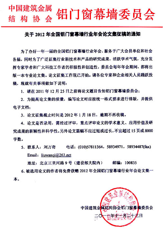 關于2012年全國鋁門窗幕墻行業年會論文集征稿的通知