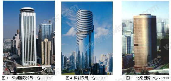 北京國貿(mào)中心則全部為茶色中空玻璃明框幕墻。1988年建成的深圳發(fā)展中心是國內(nèi)第一個(gè)隱框玻璃幕墻。