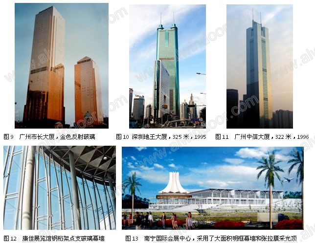 (2) 新型材料的應(yīng)用;特種玻璃、不銹鋼和鈦銅鋅等非鋁金屬板、砂巖洞石等非花崗巖石板、陶板、PVC板和ETFE膜材已在工程中大量應(yīng)用。
