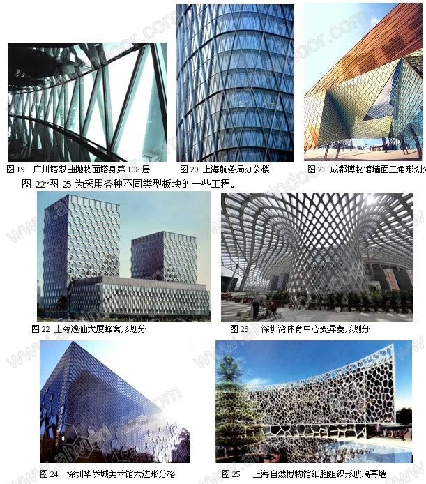 大多數(shù)幕墻采用四邊形板塊,近年來幕墻形狀日趨復(fù)雜,采用三角形板塊更能適應(yīng)復(fù)雜的曲面(圖19~圖21)。