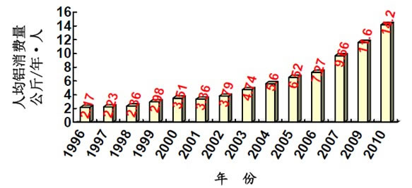 中國鋁工業,前30年,航天航空工業用材為主,夯實中國鋁工業基礎,強大了國防;近30年,在建筑等更多領域發展應用,成為大宗民用產品,鋁材在建筑業繁榮經濟中量與質皆騰飛,中國鋁材消費量躍全球居之首。 2010年中國人均鋁消費量14.2公斤/人•年,當然和人均超過30公斤/人•年的西方發達國家的人均消費量相比,還差的很遠,中國尚存很大消費增長空間。