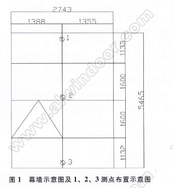 鋁合金型材;玻璃規(guī)格為:6LOW-E+12A+6(mm);實驗室大氣壓力:101.Ok帕;環(huán)境溫度20℃;工程設計值:Wk=1.0Kpa、氣密性3級、水密性3級、平面內變形2級。圖1為試件幕墻示意圖及位移