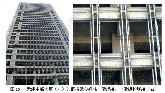 應該說,幕墻的鋼橫梁和鋼立柱可以采用螺栓或螺釘連接;也可以采用焊縫連接還可以部分節點用螺栓連接,而另外部分節點用焊接。設計者可以根據工程特點和自己的習慣靈活選用。圖15為天津中船大廈,花崗巖幕墻高148m,其鋼橫梁與鋼立柱一端為焊接,另一端為螺栓連接。