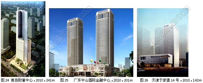 2010年超高石材幕墻大量興建,而且多數(shù)都超過(guò)200m的高度(圖21~圖30)。目前在建設(shè)中最高的石材幕墻工程是廣州廣晟大廈(圖21),建筑高度313m,花崗巖幕墻高度280m,背栓連接。