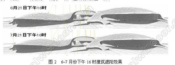 玻璃幕墻遮陽起到一定的遮陽效果。其遮陽效果在太陽高度角較高的時候效果較好,例如6~7月份的10點到16點。遮陽效果如圖2所示。