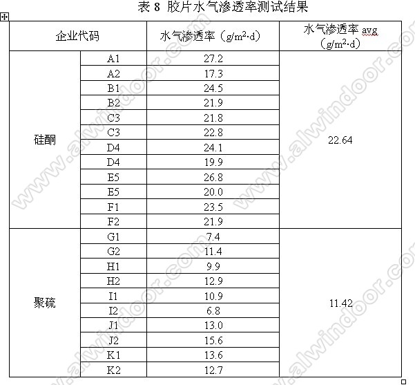 在水氣透過率的試驗中,聚硫膠的平均水氣滲透率為11.42g/m2•d,硅酮膠的平均水氣滲透率為22.64g/m2•d,硅酮膠的水氣滲透率是聚硫膠的兩倍,表明聚硫膠的抗水氣滲透能力要優于硅酮膠的。