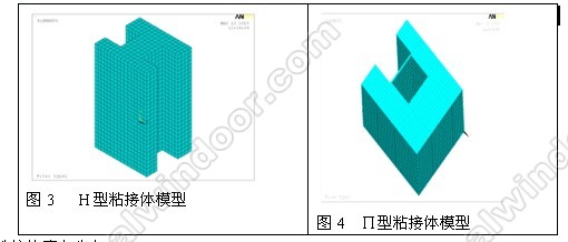 粘接體(屬柔性體)拉伸有限元分析。H型和∏型粘接體結(jié)構(gòu)如圖2。取粘接體長(zhǎng)度50mm,厚度12mm,粘接面尺寸為12mm×50mm。粘接界面質(zhì)點(diǎn)不能移動(dòng)。劃分網(wǎng)格后粘接體有限元模型如下圖。