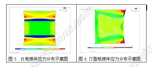 H型粘接體——應(yīng)力集中區(qū)對(duì)稱分布在側(cè)面,最大應(yīng)力0.21MPa狀態(tài)如圖5;