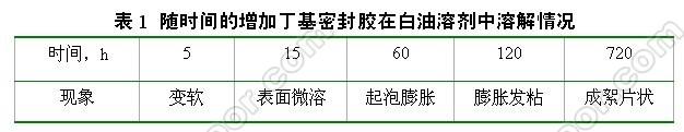 表1為隨著時間的增加丁基密封膠在白油溶劑中的溶解情況。在白油溶劑中浸泡5小時后,丁基密封膠開始變軟;60小時后,丁基密封膠開始出現(xiàn)起泡并膨脹的現(xiàn)象,白油小分子進入到丁基密封膠中,并擴散到丁基密封膠分子鏈之間,削弱分子鏈之間的相互作用力,發(fā)生體積膨脹;720小時后,丁基密封膠變?yōu)樾跗瑺睿f明白油小分子已經(jīng)把丁基密封膠大分子鏈上的鏈段或者分子鏈分割開來,使其能夠自由運動,最終致使丁基密封膠在白油溶劑中被溶解。