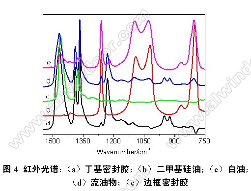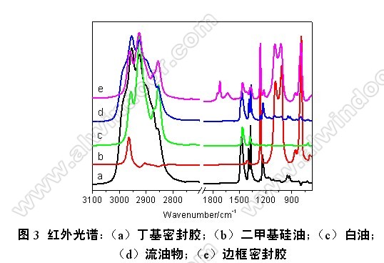 圖3分別為丁基密封膠、二甲基硅油、白油、流油物及邊框密封膠的紅外光譜圖。丁基密封膠的紅外光譜圖如曲線a所示,由于丁基密封膠主要是由異丁烯和少量的異戊二烯聚合而成,在紅外譜圖上顯示出其特有的吸收峰。在2954cm-1和2897cm-1處為甲基和