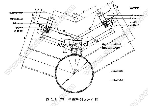 Y型懸挑鋼支座連接件由鋼方通160×60×8或鋼方通160×60×6與鋼管Φ194×8焊接,再由定位