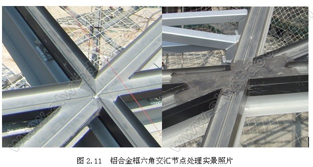 在細部節(jié)點的處理上,還考慮極少量的滲漏水進入空腔內(nèi)六角交匯處鋁合金轉(zhuǎn)換型材密封處理。所以在設(shè)計鋁合金轉(zhuǎn)換型材六角拼接位置通過裁剪與轉(zhuǎn)換型材大小一樣的三元乙丙膠皮,通過密封膠固定在鋁合金轉(zhuǎn)換型材空腔內(nèi),再由玻璃自重壓密實。通過現(xiàn)場施工圖片情況效果良好(如圖2.11)。