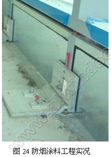 目前常用的防煙材料有二種:貼箔巖棉或礦渣棉;丙烯類涂料或硅類涂料。圖24為采用防煙涂料的工程實況。這里,根據一些公開的數據我們粗略比較一下這二種產品。有實驗數據稱,無貼箔防火棉比有貼箔防火棉組成的防煙層(貼箔面與周邊留3mm空隙,用防火膠填充),煙霧穿透量要高出304倍[21]。根據ASTM E96和 ASTM F-1249 標準測試方法,大部分貼箔防火棉的煙霧穿透量Perms=0.02[22],則無貼箔防火棉的Perms=6.08;當采用防煙涂料時,它的Perms=0.3[23],(涂料厚度是2mm),即防煙涂料的防煙性能比無貼箔防火棉要高20倍。Perms的單位是Grains/ (hr.×ft2 × inch-Hg), 國際單位是g/ (hr.× m2 × mm-Hg):Grains: 美國用作重量單位;hr.:小時;ft:英尺;inch-Hg:英尺水銀柱高;g: 克;mm-Hg:mm水銀柱高。當Perms<1時認為具有較好的防煙效果。