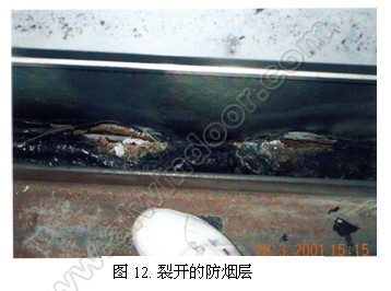 韌性,說明防火棉上側的溫度值大部分在防煙層工作溫度范圍內。在靠近背板附近因受到高溫影響有部分已脫裂開,形成煙霧上升通道(圖12)。由于這層防煙層伸縮性為50%,基本上保證了與周圍材料的有效